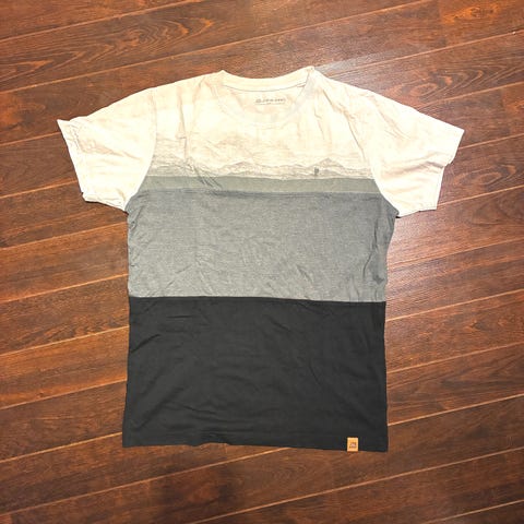 Med lys rosa, hvite og beige striper. Pent brukt.