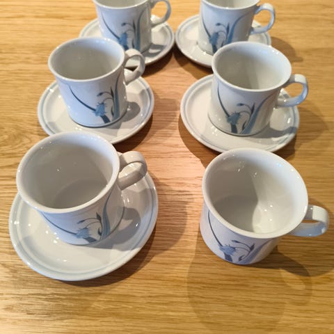5 sett kopp/ skål i Blåklokke fra Figgjo. Som nye. Selges 40,- for kopp og skål . Har mange kopper til 25 ,- Høyde 8 cm. Diameter 7 cm. Sender post.