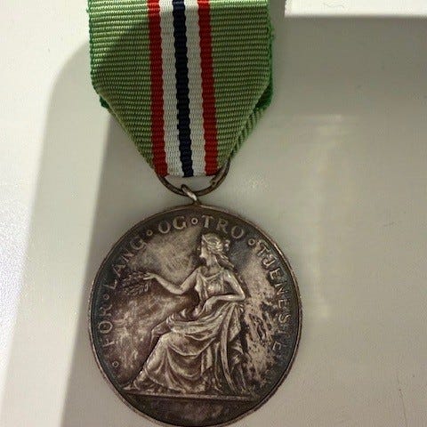 Selger en over 90 år gammel fortjenstmedalje i sølv fra Det Kongelige Selskap for Norges Vel. Medaljen er gravert med navn og 1933, som er året den ble tildelt. Silkestoffet den henger i er litt medtatt etter alle disse årene, men medaljen er fortsatt fin. Det var en umåtelig stor heder og ære å få utdelt en slik medalje på den tiden! Medaljene utdeles faktisk fortsatt, men oppmerksomheten rundt den har nok bleknet en del med årene.