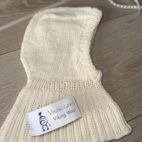 Heklet Balaklava med høy hals. Svært varm og tett. Passer best til kaldt vær. Størrelse S eller barn. Ca 55 cm lengde utslått. 100% ull. Pulsvarmere i samme garn. Selges for kr 300,- + porto