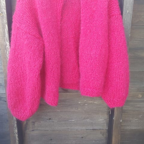 Flott strikkejakke - nydelig og lett å ha på. Strikket i «Kidsilk. Passer en str M/L. Kan sendes mot porto💚