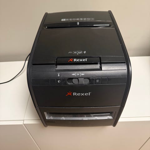 Rexel 100X makulator med funksjoner for makulering av dokumenter. Enheten har kontrollpanel med knapper for drift og sikkerhet, og en uttrekkbar beholder for oppsamling av makulert materiale. Passer til kontorbruk for sikker destruksjon av papirer.