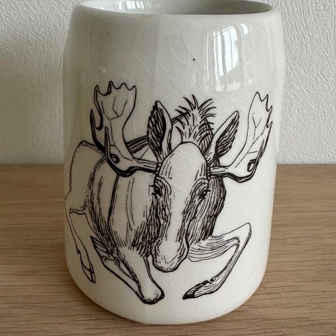 Stor flott vase med Tranemotiv. Høyde 22cm, dia.10,5×12cm. Dekorasjon Per Neergaard. Evnt frakt i tillegg v sending.