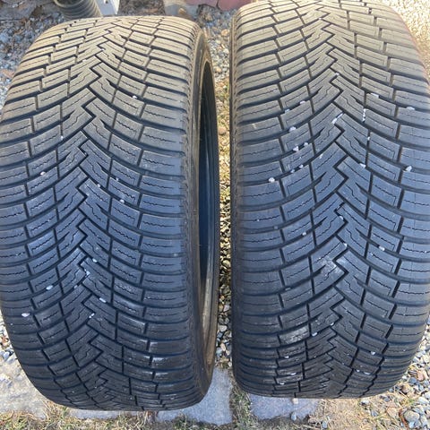 Dekkene er ubrukte og har følgelig full mønsterdybde og alle pigger intakt.