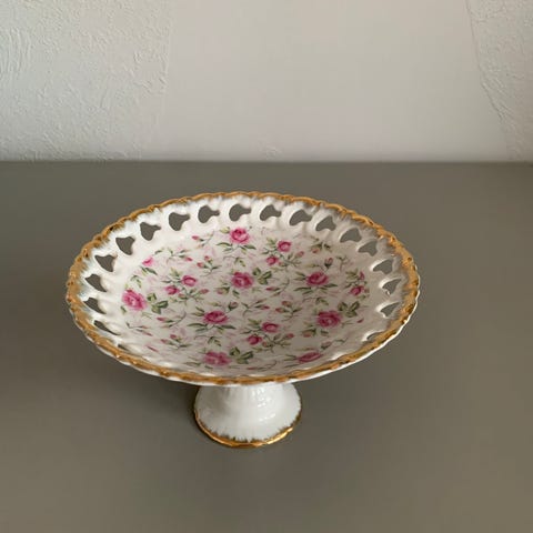 Silesia porselensskål selges for kr. 100,-. Rosemotivene er svært godt bevart. Det er en liten avskaling på utsiden av kanten.