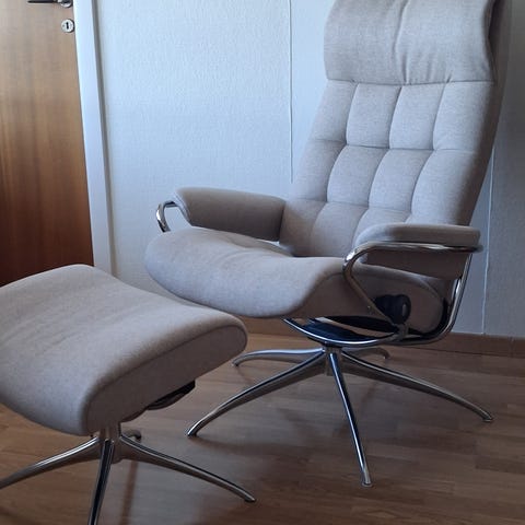 To så og si ubrukte Stressless Jazz lenestoler med krakker. Dette er vakre møbler:)