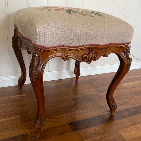Gammel krakk med brodert sittepute