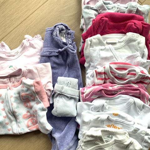 Pakke med fem pent brukte strømpebukser fra Cubus i størrelse 50/56. To hvite, en grå, en mørk blå og en stripet. Selges samlet.