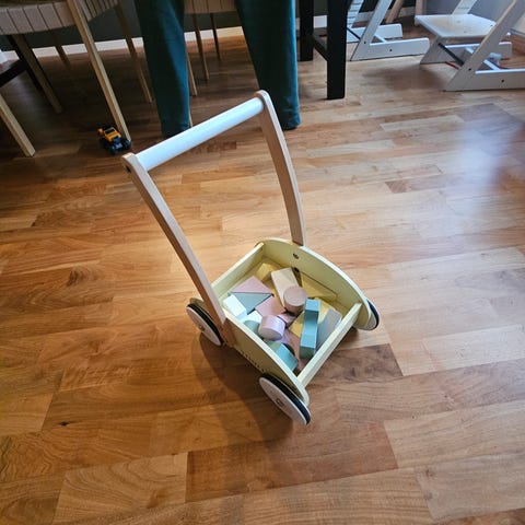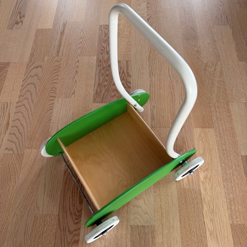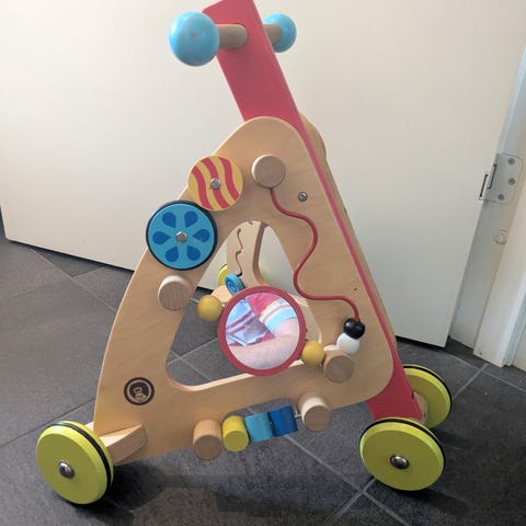 Solid gåvogn i tre, stødig med bra tyngdepunkt, doble hjul som ikke sklir. Har og justerbare bremser som gir optimal motstand ifht utvikling hos barnet. ‘Sete’ foran hvis storesøsken vil kjøre den minste først eller lett legge på annen frakt. Helt annet nivå av hjelpemiddel enn eks brio. Veldig god som hjelp når barnet vil opp og gå!!