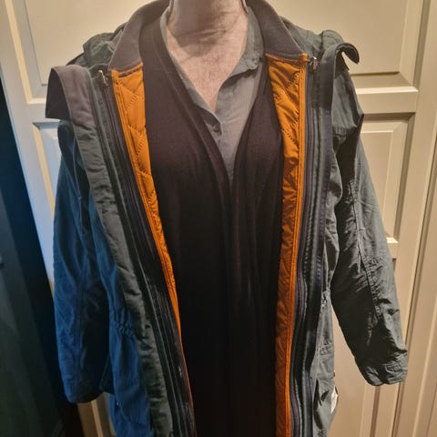 3 i 1, med quilta innerjakke som kan brukast for seg sjølv. Str XS, men stor i str, så meir ein S.