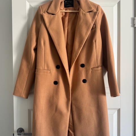 Ny, beige kåpe som holdes sammen av belte. V-utringning m/slag. Skrålommer. Splitt bak. Str. S. Polyester.