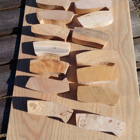 Tre knivhåndtak og et emne. De måler 10-12cm. Selges samlet.