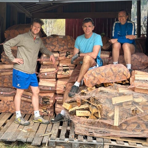 Sixten (8år) sin bjørkeved - kløyva med øks og pakka i 80l sekker. 110kr pr sekk. Veden er lagra innendørs og er helt tørr.