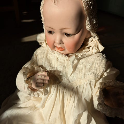 Øynene skal settes i og justeres med voks for så å støpes fast med gips. Hodet skal settes fast på en fransk kropp som denne dukken skal ha. Settes en papp skal over toppen på hodet og parykk skal syes av mohair vaskes og rulles opp og formes slik vi vil ha det.
