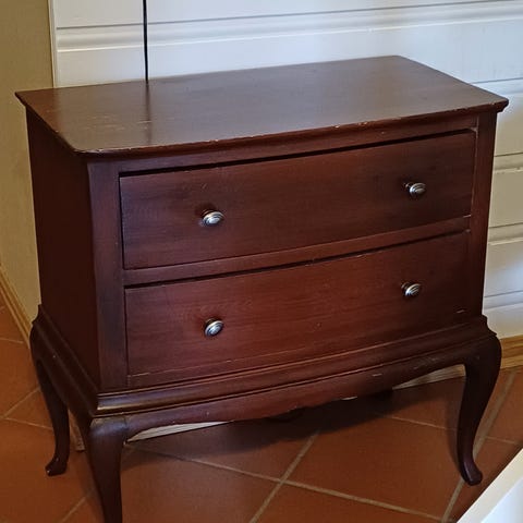 Kommode med 2 skuffer i tre, i brun utførelse. Møbelet har buet front, utskårne ben og dekorative beslag på skuffene. Fronten er dekorert med intarsialignende mønster. Passer som oppbevaringsmøbel i stue, gang eller soverom. Materialet er edeltre så vidt jeg kan se i klassisk stil.