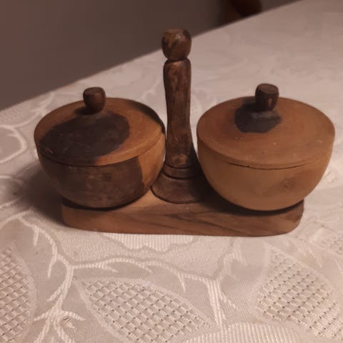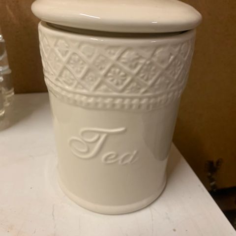 Osteklokke, smørboks og 2 påleggsbokser selges samlet.