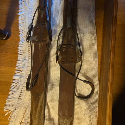 Vintage ski lær skibindinger i brun farge. Laget av slitesterkt lærmateriale, ideell for bruk med tradisjonelle ski. Passer godt for samlere eller entusiaster av gammeldags skiutstyr.