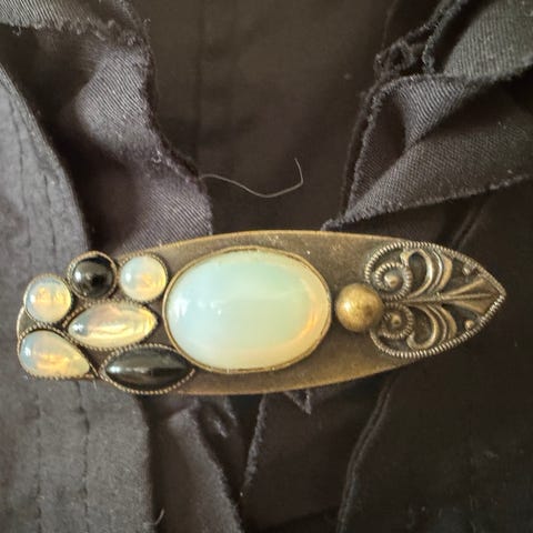 Nål i gullfarge med blågrønn maling. Maling er borte på noen plasser. Nålen er fra 1945