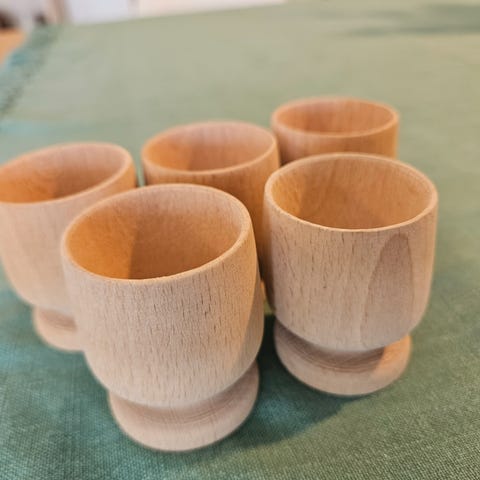 Fire stykk eggeglass selges samlet. Laget i ubehandlet tre. Trolig håndlagde. Er fine som de er, men kan også for eksempel beises.