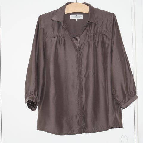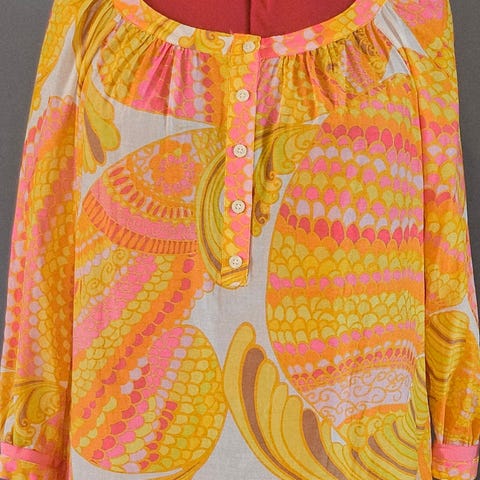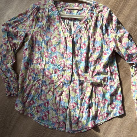 Nydelig flerfarget mønstret overdel med rund hals og kort erm. God kvalitet. En fold i ryggen gjør blusen romslig å ha på Stoffet er litt "blankt" (silkeaktig). Veldig fint fall i stoffet. Brukt 1 gang. Ny pris ca 1000