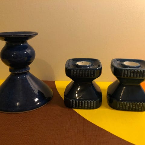 2 små lysestaker som kan være små vaser Blått og Hvitt