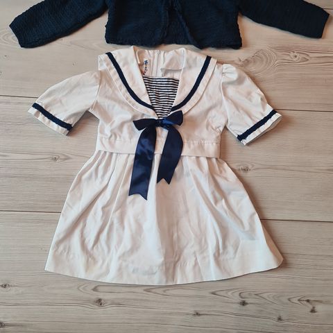Nyttårskjole? Kjole med tilhørende truse og bolero. Jakken er i velur, resten i silkeaktig stoff. Nydelig antrekk til barnedåp, bryllup eller bursdagsselskap. Str str 24 mnd. Brukte den sist i jula med 3 åringen. Så kan passe fra ca 1,5 år (str 86) og til 3 år (98).