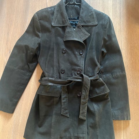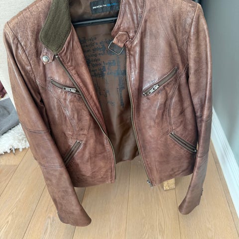 Unik vintage / retro moto / motorcycle / biker skinnjakke m/ korsett snøring og belte i ekte skinn . Den har også litt skulderputer . 3/4 ermer . 1 lomme m/ glidelås på brystet. Kule detaljer på sidene med korsett snøring, og på ryggen . Farge: svart . Detaljer i mørkt metall. Beltet har 3 hull. Str: S. Passer XS / S . Pent brukt, kan være noen bruksmerker/ slitte partier.