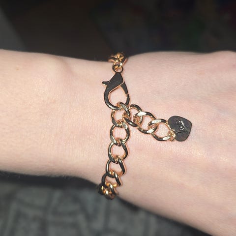 Gullfarget armbånd med to klare stener formet som en sløyfe/bow. Delikat og pent. Det er håndlaget og kjøpt på Etsy.