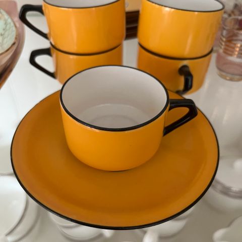 Skjeldent dekor. 6kopper, 5tefat, 6asjetter og fløteservise. Lokket på sukkerkoppen er skadet. Se bilde. 19deler.
