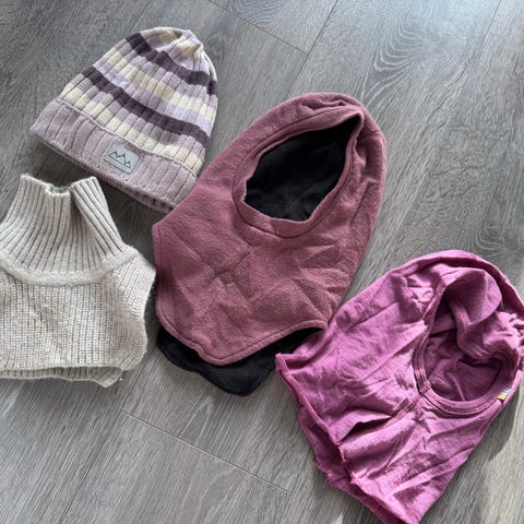 Den ene luen er fra Lego. Den er lilla og er i størrelsen 54 (8-10år).