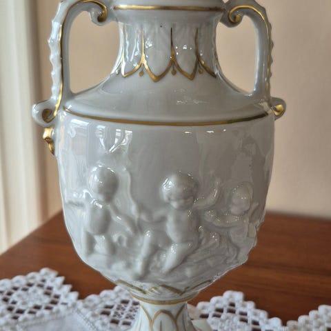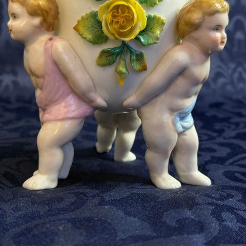 Antikk porselen kurv/Tysk porselen kurv/sjelden porselen kurv/antikk pynte porselen/thüringen porsen/gammel porselen/schierholz porselen/antikk presang/porselen kurv med scherub/old porcelain/antique collect/antique german porcelain/sjelden porselen med putti/samler objekt/antikk presang/gave/antikk gave/antikk porselen kurv/sjelden porselen kurv/sjelden porselen kurv.