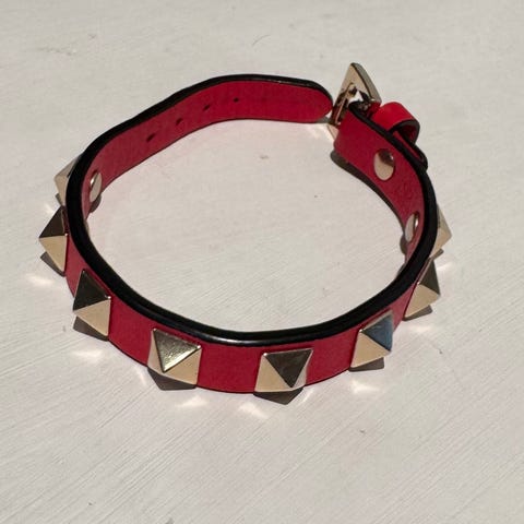 Tøft og samtidig elegant vintage armbånd i saffiano lær fra Prada. To store pyramide studs i gullfarge, svart på utsiden, orange på innsiden, liten plakett med Prada logo i sølvfarge, hull med .med sølvfarget kant, lukkes med «beltespenne», hempe, logo inngravert på siden av spennen.