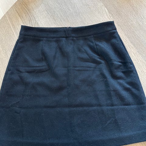 Fint a- formet skjørt i ullblanding. Skjørtet er foret. Størrelse 36-38. Livvidde 80 cm, lengde 51 cm.