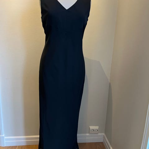 Helt nye Lang selskaps kjole fra In Wear. Kjolen har et gjennomsiktig stoff i chiffon utenpå et blankt svart stoff. Glidelås bak og snitt på en side av kjolen. Sitter pent. 50 % polyester 50 % nylon.