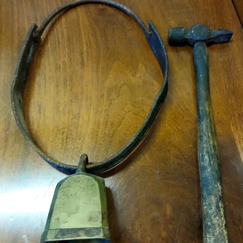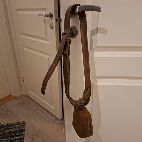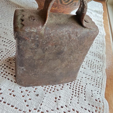 Antikk kubjelle i malmgods (eller messinglegering) med toppfeste i jern