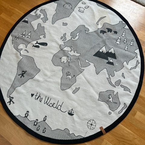Selger et teppe fra OYOY. Det svarte har blitt bittelitt falmet i vask og har noen nupper (se bilde), men fortsatt masse bruk igjen.