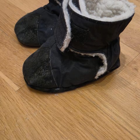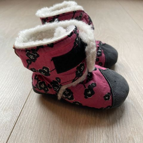 Kan brukes innendørs som tøfler, eller i vogn. Kan sikkert brukes til lek ute også, men det har ikke vi gjort. Vært brukt i vogn av oss. Barneføtter holder seg varme og gode oppi disse. Har brukt dem fra fødsel og ganske lenge, ca 1 år tror jeg. Satt godt på foten fra 6 mnd og utover. Regulerbar borrelås lukking.