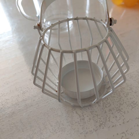 Gråhvit telysholder med hank for enten kubbelys, telys eller ledlys.
