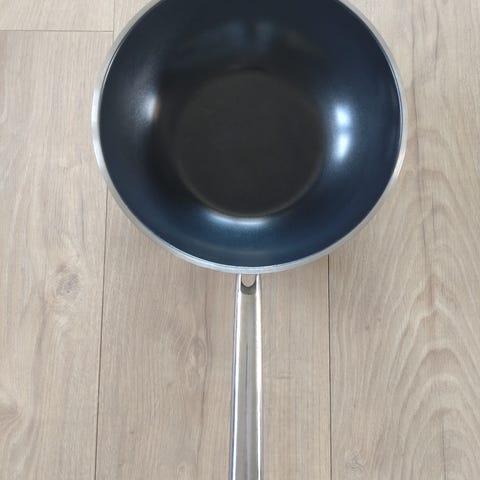 Wok selges - woken er 33 cm i diameter og har non-stick belegg. Noe av non-stick belegget har flasset av på utsiden av kanten som vist på det ene bildet, men det er kun på utsiden.