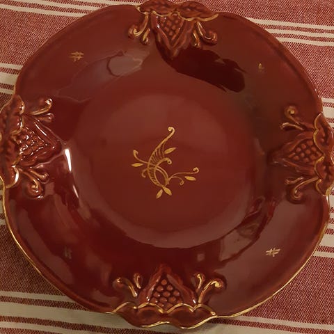 20-, 30-talls porselen med art deco elementer. Korpus, dekor og fargesatt av Nora Gulbrandsen. Særpreget og originalt sett, følger med et «bonus» lokk, antagelig fra en kanne.