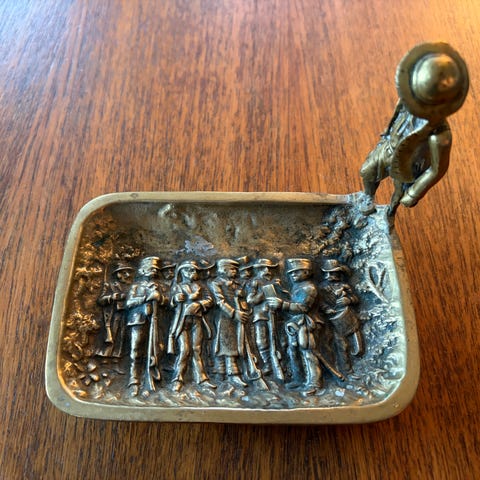 Figuren er i god, brukt stand med noe patina og bruksmerker på metallet, som vist på bildene. Dette bidrar til figurens autentiske vintage-preg. Innsiden er hul (se bilde).