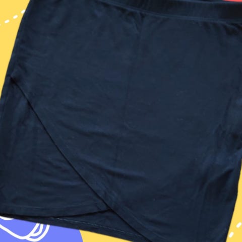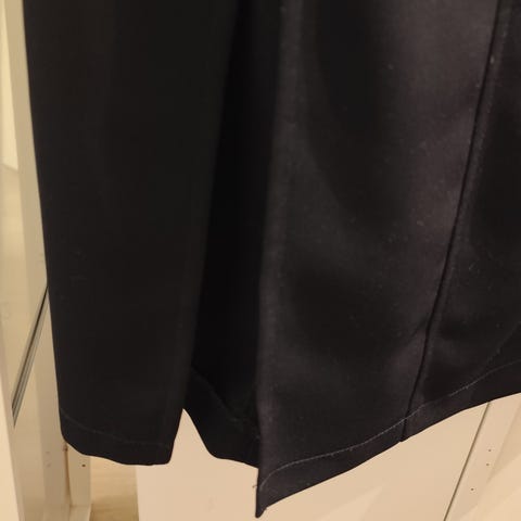 Svart skjørt med knyting og glidelås str 34. Det ble på et tidspunkt et lite hull i sømmen som er sydd igjen bak