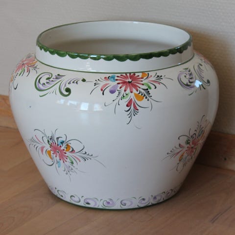Fint sett med liten urne og skål i lett keramikk med flettenett på utsiden. Et hull i nettet ellers ingen anmerkninger. Nb! skal ikke ha vann i dette materialet, til info.