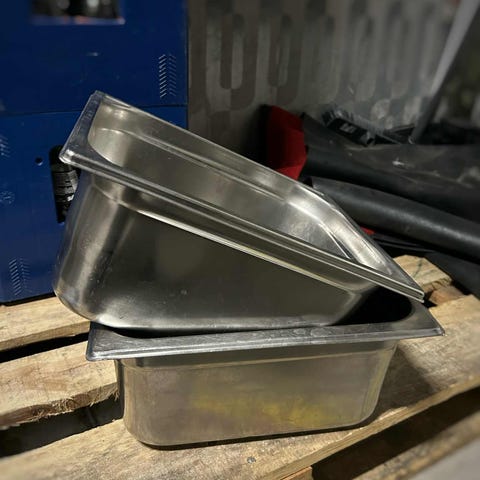 Sett med rustfrie stål gastronormbeholdere i 1/3 størrelse. Beholderne har et rektangulært design og er egnet for oppbevaring og servering av mat i profesjonelle kjøkkenmiljøer.