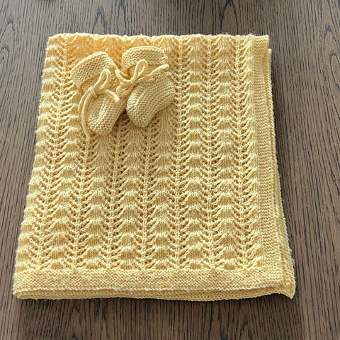 Hjemmestrikket babyteppe i garn Lima fra Drops Design. Lima er et 4-tråds sportsgarn laget av 65% Peruvian Highland ull og 35% superfin Alpakka. Vaskes med håndvask maks 30%. Tørkes flatt.