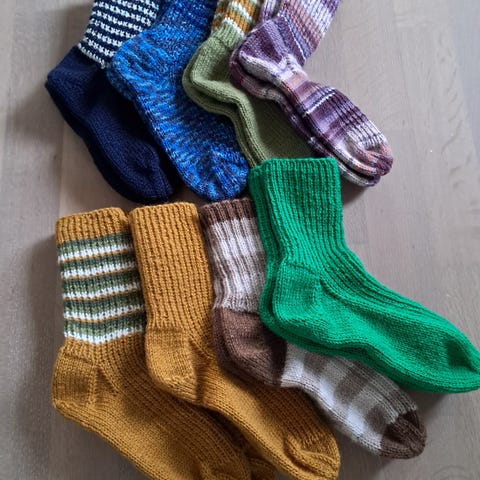 Ullsokker fått i gave. Brukt en gang og så "lagret" i sokkeskuffen. Hjemmestrikk.