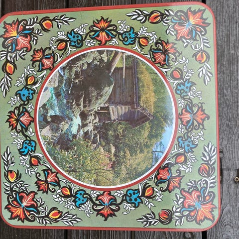 Eldre kakeboks i metall med flott nasjonalromantiske motiv og bilder rundt hele boksen