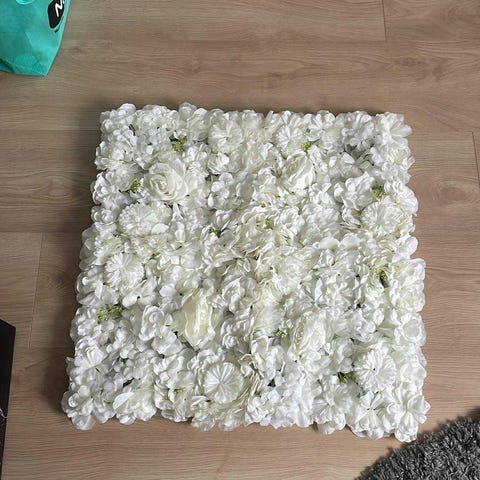Hvit Blomstervegg med forskjellige blomster som gjør den helt unik! Og passer til alle anledninger!