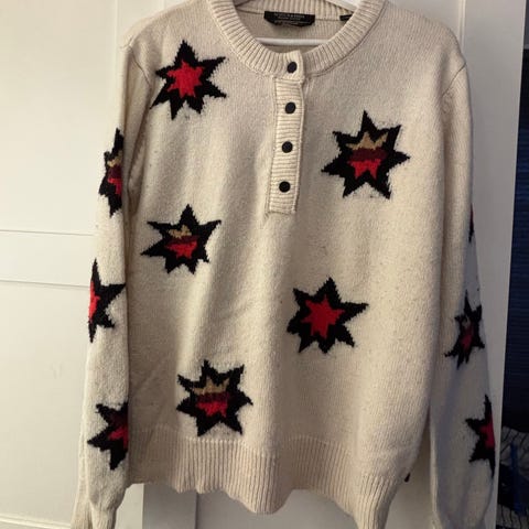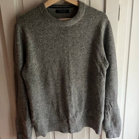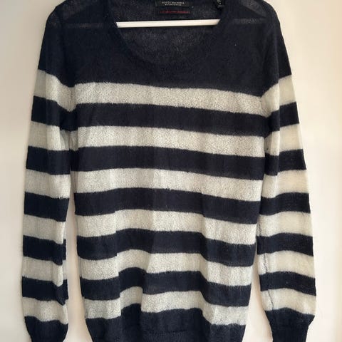 Ullgenser fra kvalitetsmerket Scotch & Soda, 28% Mohair i denne og 29% ull. Den er ganske tynn med små pynte-huller i. Men god og varm allikevel. Split nede, og er litt lenger bak enn foran. Usikker på størrelse, men den passer flere størrelser da den er god stretch i. Er selv Large. Kjøpt på Høyer