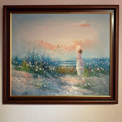 Håndmalt maleri med signatur i nydelige blå- nyanser. Sølvfarget ramme. B ca 64 cm H ca 53cm . Kan sendes med Post Nord 129kr eller med Norgespakken / sporing mot et tillegg på 135kr
